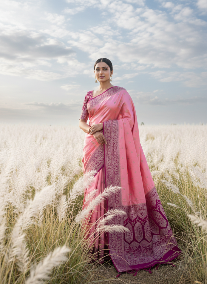 This elegant Mashru silk saree features a soft pink base adorned with delicate woven motifs and a rich contrasting border. Known for its unique blend of silky shine on the outside and cotton comfort on the inside, this saree offers both luxury and ease. A timeless choice, perfect for festive celebrations, traditional gatherings, or special occasions.