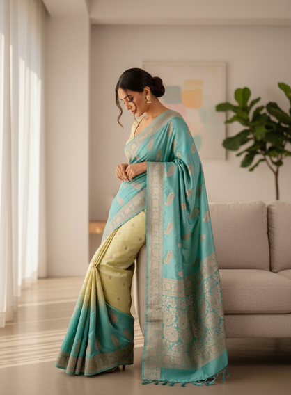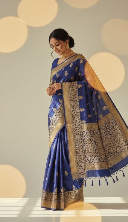 Elegant blue banarasi Katan silk saree,featuring subtle stripes and rich golden borders ,truly timeless.