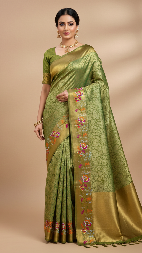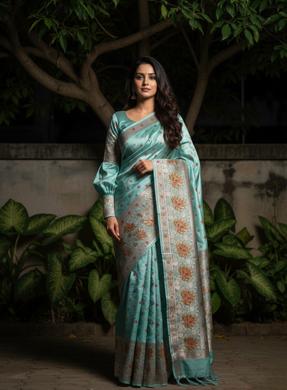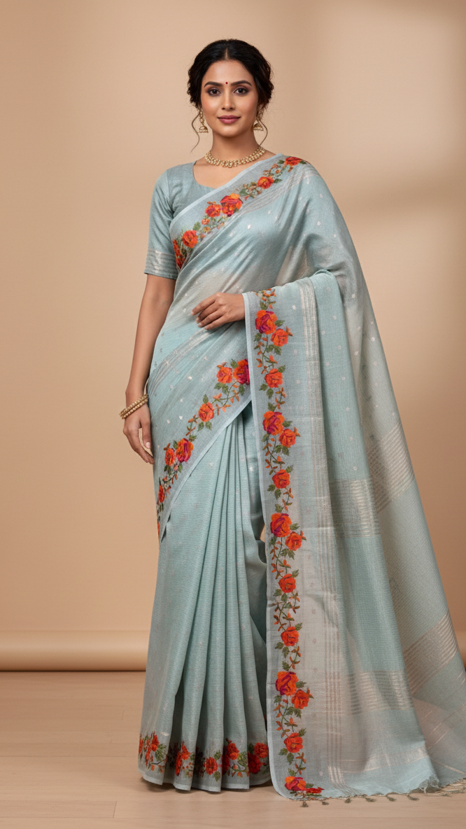 Beautiful banarasi Tissue silk saree,light blue with exquisite orange floral embroidery,simply stunning.