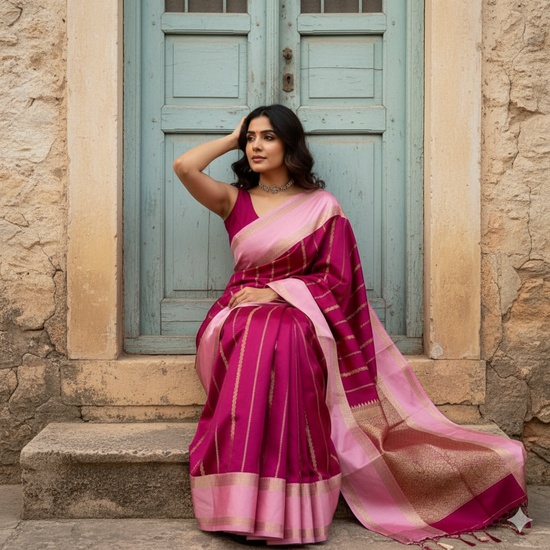 This elegant Mashru silk saree features a soft pink base adorned with delicate woven motifs and a rich contrasting border. Known for its unique blend of silky shine on the outside and cotton comfort on the inside, this saree offers both luxury and ease. A timeless choice, perfect for festive celebrations, traditional gatherings, or special occasions.